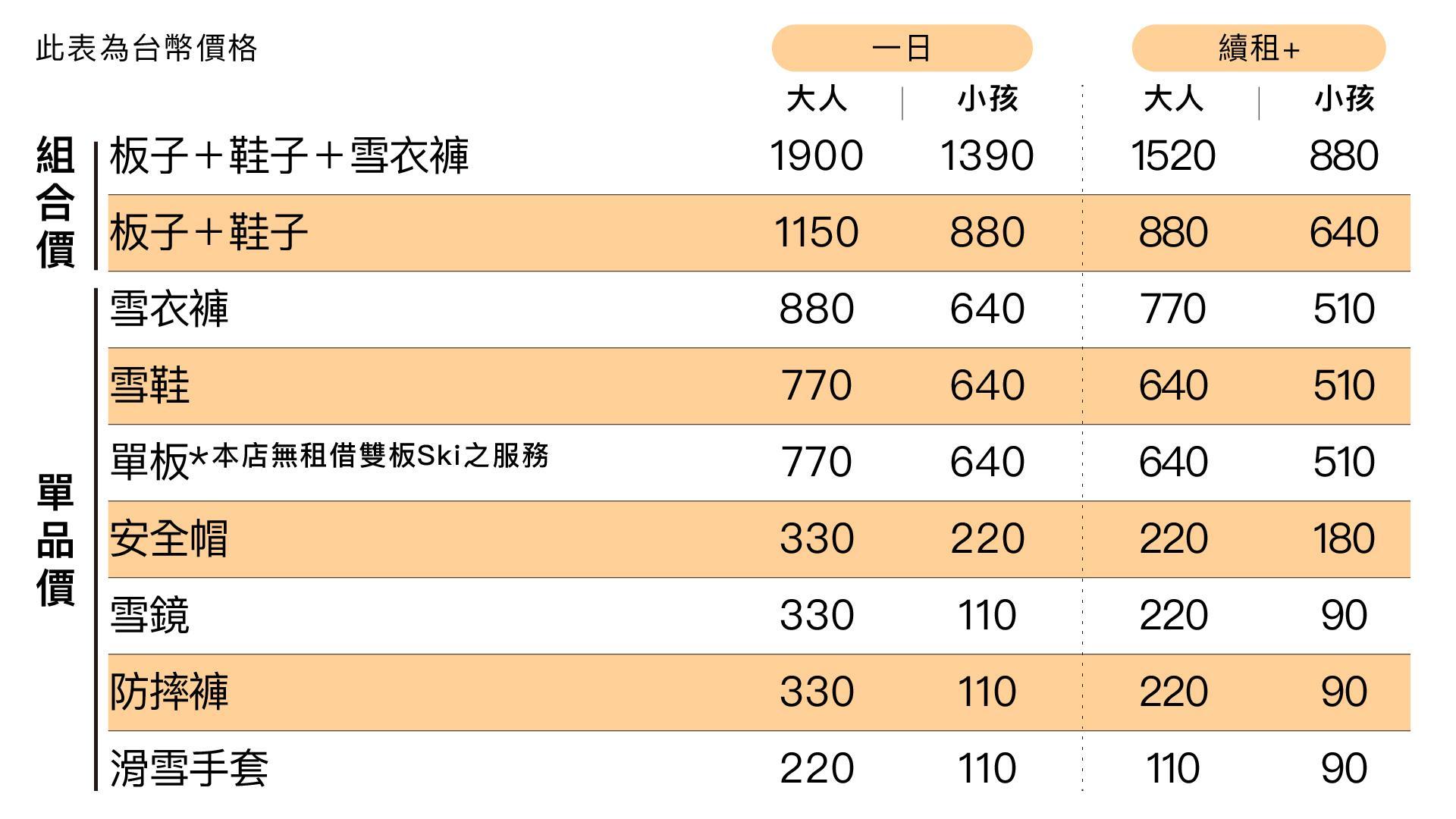 - 凡選購雪具租借,搭配滑雪課程,即可享有雪具租借費用專屬 95折優惠。欲知更多詳情,請洽詢我們的官方 LINE 客服人員。